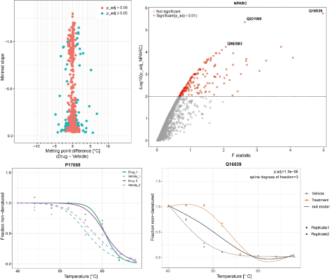 对搜库数据进行预处理,以各组37℃的样本蛋白定量值为基准,计算各温度处理下蛋白剩余组分,对预处理后的数据进行分析。包括蛋白热熔曲线分析(通过比较实验组与对照组的ΔTm来筛选靶点)与非参数分析(通过统计学差异分析筛选靶点)两种方式。