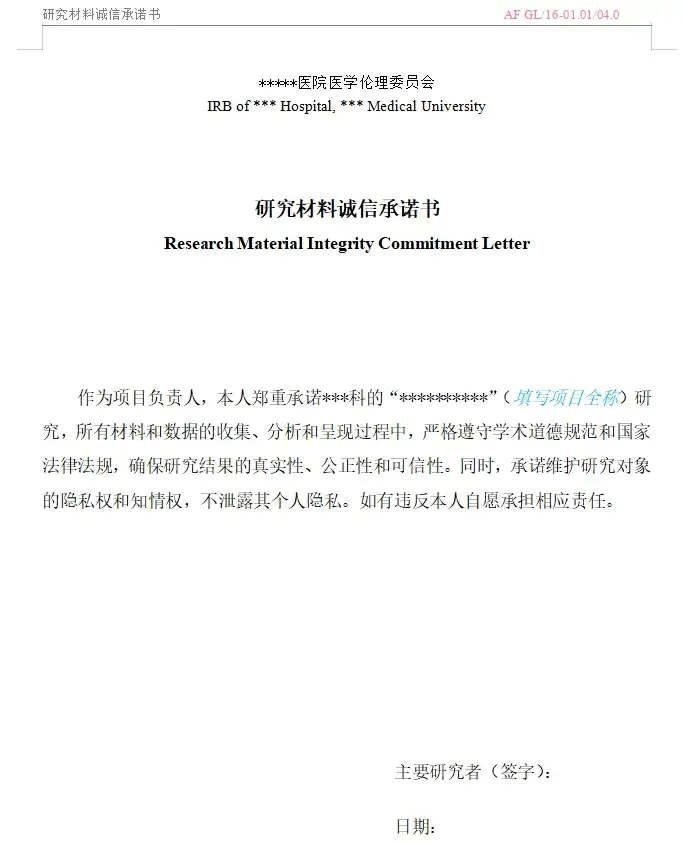 这是声明性法律文件,承诺研究数据无虚假、流程符合伦理规范(包括不造假、不篡改、不隐瞒)。须项目负责人亲签,加盖单位行政公章(禁用课题组/科室章),具法律效力。