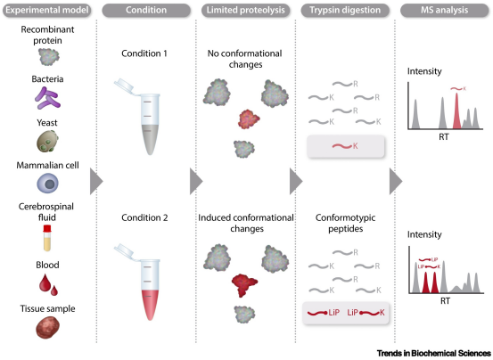 2、有限蛋白酶解(LiP):在非变性条件下提取蛋白质,然后加入广谱蛋白酶进行短暂孵育。酶的用量和孵育时间需要精确控制 。