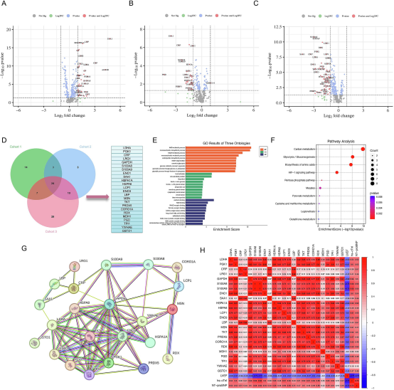 该研究首先对51名健康受试者和153名FM患者的血浆蛋白水平进行了比较,并分析了24名FM患者治疗前后的血浆蛋白质组学变化,以及40名急性期和22名恢复期FM患者的差异。结果显示,样本在DIA-MS中具有明显的聚类模式,组间分离良好。通过交集分析,我们筛选出24种与FM进展相关的重叠蛋白,包括S100A8和S100A9。GO和KEGG富集分析表明,这些蛋白主要涉及先天免疫激活、代谢紊乱和炎症反应。蛋白-蛋白相互作用网络分析进一步揭示了炎症相关蛋白与代谢相关蛋白之间的相互作用,提示炎症过度激活与代谢紊乱之间存在关联。