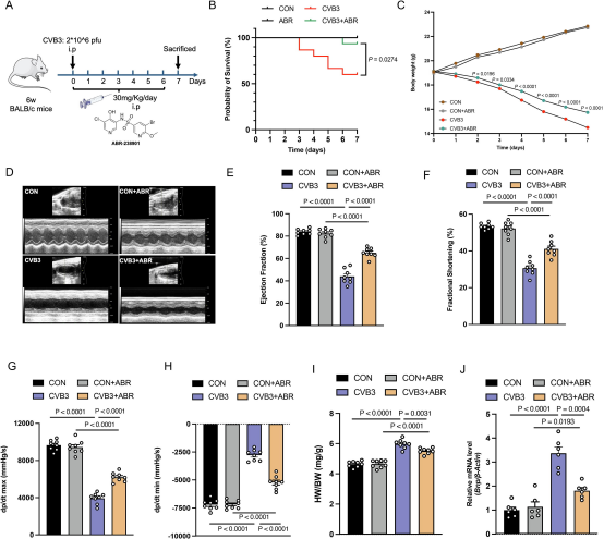 ABR-238901作为S100A8/A9阻断剂,能特异性抑制其与TLR4和RAGE的相互作用,减少炎症信号通路的激活。为了探索S100A8/A9阻断在FM中的治疗效果,研究通过腹腔注射ABR-238901治疗CVB3诱导的心肌炎小鼠。生存分析显示,ABR-238901治疗显著降低了心肌炎小鼠的死亡率,更重要的是减轻了病毒感染引起的心脏功能下降及减轻了炎症反应。