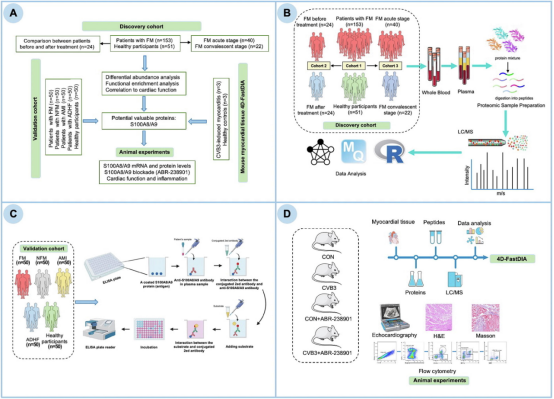 该研究采用了多阶段、多队列的研究设计,结合临床样本的蛋白质组学分析和动物实验验证,以全面评估S100A8/A9在FM中的作用。该研究通过建立包含153例FM患者和51例健康对照的发现队列,以及50例FM患者、50例NFM患者、50例AMI患者、50例ADHF患者和50例健康对照的验证队列,采用DIA-MS技术对血浆样本进行蛋白质组学分析,筛选出24个与FM相关的差异表达蛋白,其中S100A8和S100A9因与心功能指标高度相关被选为研究重点。通过ELISA验证了S100A8/A9在FM患者中的表达水平,并在CVB3诱导的小鼠模型中评估了S100A8/A9阻断剂ABR-238901的疗效,结果表明S100A8/A9具有作为FM诊断标志物和治疗靶点的潜力。