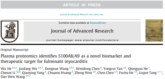 文献:He W, Wu J, Wang D, et al. Plasma proteomics identifies S100A8/A9 as a novel biomarker and therapeutic target for fulminant myocarditis. J Adv Res. Published online June 4, 2025. doi:10.1016/j.jare.2025.06.005