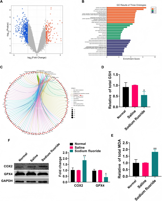 在发现NaF促进近视后,进一步探究其背后的分子机制,明确是否与铁死亡通路相关,研究收集生理盐水处理组和NaF处理组小鼠的视网膜组织进行蛋白质组学分析,通过严格的筛选标准筛选差异表达蛋白,并进行GO和KEGG通路富集分析;利用铁死亡检测试剂盒检测小鼠组织中的生化指标,通过Western blotting检测铁死亡相关蛋白;同时检测不同浓度NaF处理后661W细胞的活性和ROS水平。结果显示蛋白质组学分析发现181个显著上调和496个显著下调的蛋白,且大量差异蛋白富集于铁死亡通路;与生理盐水处理组相比,NaF处理组小鼠视网膜中GSH含量降低、MDA含量增加,GPX4表达减少、COX2表达增加;NaF处理后661W细胞内ROS积累增加,细胞活力下降,表明NaF会激活铁死亡通路。这表明NaF促进近视可能通过激活铁死亡通路,为理解近视发病的分子机制提供了新视角。