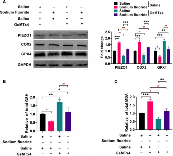 基于铁死亡通路中蛋白富集分析结果,为探究PIEZO1是否在NaF诱导的铁死亡中发挥作用,明确NaF对PIEZO1表达的影响,研究通过多模态分析方法,在NaF暴露后对小鼠视网膜组织中PIEZO1的mRNA和蛋白水平进行定量检测;用不同浓度的NaF处理661W细胞,收集RNA和蛋白检测PIEZO1的表达。结果显示NaF暴露后,小鼠视网膜组织中PIEZO1的mRNA和蛋白水平显著上调;661W细胞中PIEZO1的mRNA和蛋白表达量随NaF浓度升高而增加,呈剂量依赖性,表明NaF会促进PIEZO1在体内和体外的表达。这表明PIEZO1可能是NaF激活铁死亡通路的关键分子,为后续机制研究奠定基础。