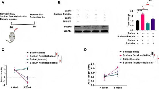 本研究以4周龄雄性C57BL/6J小鼠为动物模型,通过眼表滴注NaF溶液构建近视模型,同时设置生理盐水对照组、PIEZO1抑制剂(GsMTx4)和激活剂(Yoda1)玻璃体注射组、黄芩苷灌胃组,结合661W感光细胞的不同浓度NaF及黄芩苷处理,运用屈光状态和轴长测量、Westernblot、qPCR、铁死亡标志物(GSH、MDA)检测、蛋白质组学分析、分子对接及CETSA等方法,探究NaF诱导近视的机制及黄芩苷的干预作用,采用单因素方差分析结合Bonferroni事后检验进行统计分析。