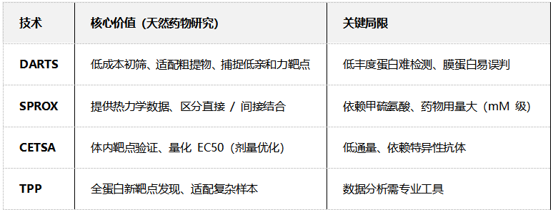 这些无标记技术的发展为天然药物靶点筛选提供了 “不破坏天然产物活性、贴近生理场景、适配多靶点特性” 的解决方案。其中,DARTS 与 SPROX 在初筛与机制解析中不可或缺,CETSA 是体内验证的关键,而 TPP 则凭借高通量、无预设靶点的优势,成为天然药物 “新靶点发现与复杂机制解析”的核心推动力。