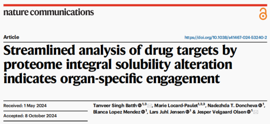 1. Batth TS, Locard-Paulet M, Doncheva NT, et al. Streamlined analysis of drug targets by proteome integral solubility alteration indicates organ-specific engagement. Nat Commun. 2024;15(1):8923. Published 2024 Oct 16. doi:10.1038/s41467-024-53240-2