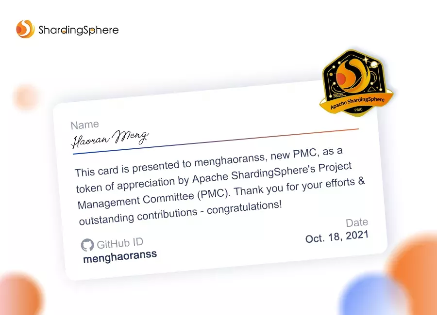 10 月,Apache ShardingSphere 迎来了一位新的 PMC 成员--SphereEx 高级 Java 工程师孟浩然(menghaoranss)。