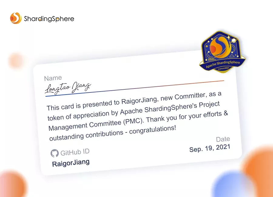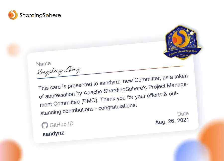 近几月,经过 Apache ShardingSphere PMC 的提名与审核,来自 SphereEx 的两名研发工程师钟红胜(sandynz)和江龙滔(RaigorJiang),共同入选成为 Apache ShardingSphere 项目的新晋 Committer。与此同时,Apache ShardingSphere 社区贡献者成员数量也正式突破 300 人,社区队伍进一步壮大,这是 ShardingSphere 在成长路上的又一个里程碑事件。