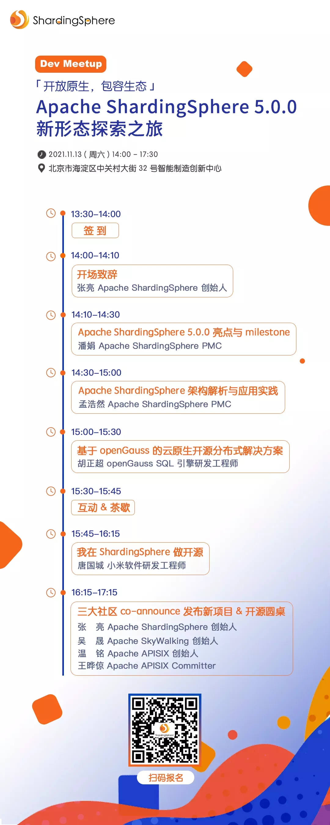 11 月 13 日,由 Apache ShardingSphere 社区主办的【Apache ShardingSphere Dev Meetup】将于北京市海淀区中关村大街 32 号智能制造创新中心 1 楼多功能厅举行。本次活动以【开放原生,包容生态 | Apache ShardingSphere 新形态探索之旅】为主题,聚焦最近更新的 Apache ShardingSphere 5.0.0 正式版本的新特性,邀请到 Apache ShardingSphere、Apache SkyWalking、Apache APISIX 等顶尖社区的技术大牛到场,从社区建设、技术合作、生态共建等多个角度,共同探索开源社区治理的新方式。