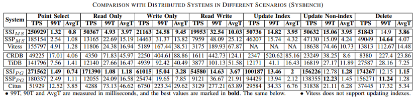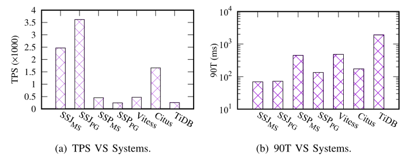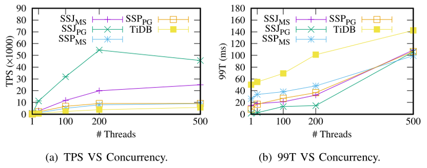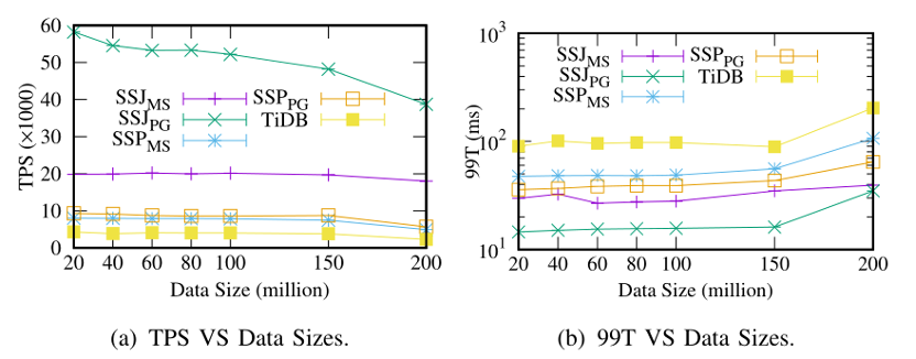 可伸缩性实验。接下来我们只与 TiDB 进行对比,因为它相比于别的系统性能最优。如图 12,基于 SSJ 的系统总是执行得最好。