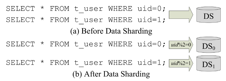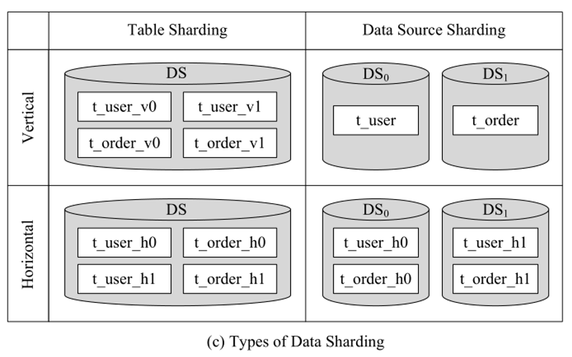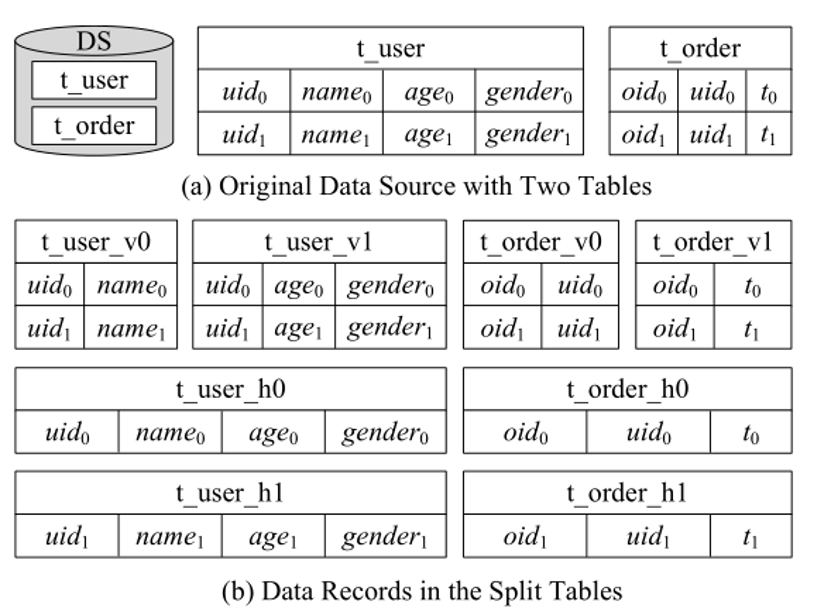 数据分区是 ShardingSphere 中最重要的功能之一。它将数据拆分并根据一定的条件将其存储在多个表或数据源(这里的数据源即为逻辑数据库,下同)中。ShardingSphere 提出表分片和数据源分片,每种分片有水平和垂直两种分片方法,下图 4 给出四种类型分片的例子。图 4(a)是原始数据库及其内部表的结构和数据。图 4(c)为垂直表分片、水平表分片、垂直数据源分片以及水平数据源分片四种分片方式。其中分片后的表格结构为 4(b)所示。垂直分片改变了结构,在应用时需要不时调整架构设计,无法很好地满足互联网业务快速变化的需求。相比之下,水平数据分片可以突破单台机器存储量的限制,并且可以更自由地扩展,本文主要对水平分片进行研究。