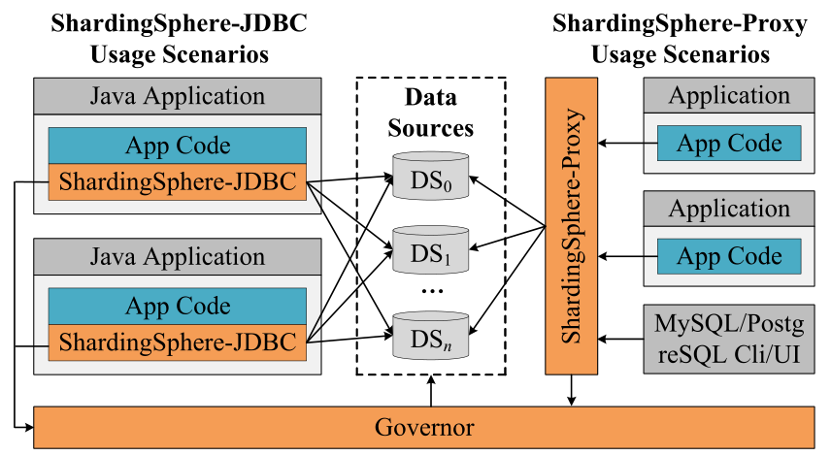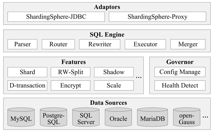 ShardingSphere 包含两个适配器:ShardingSphere-JDBC 和 ShardingSphere-Proxy。前者可以被视为增强的 JDBC 驱动程序。它封装了整个 SQL 引擎和 ShardingSphere 提供的其他功能,可以在任何使用 JDBC 的地方使用。后者是一个代理服务器,它将来自应用程序的请求转发到数据源。它提供了一个连接池,因此不同的应用程序和不同的查询可以共享同一连接。ShardingSphere-Proxy 将自己伪装成 MySQL 或 PostgreSQL 数据库。所以它对应用程序开发人员是透明的,并且支持任何编程语言。