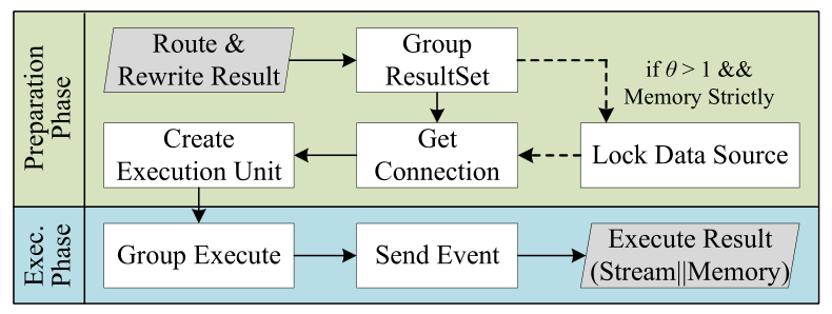 执行阶段。在此阶段,将组中的执行单元一起发送到对应的底层数据源。数据源并行执行 SQL,并为分布式事务或监视发送事件消息。