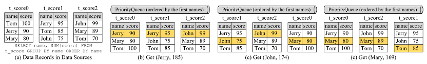 对于迭代语句我们采用流合并的方式,只需要将结果按照数据库游标逐一合并。对于排序(Order by)语句而言,因为每个数据源返回的结果集是有序的,我们采用流合并来使用多路合并算法将这些结果集合并为一个结果集。如果语句同时包含 GROUP BY 和 ORDER BY,并且 GROUP BY 和 ORDER BY 的属性相同,则可以使用流合并。因为组中的数据记录都位于游标所指向的第一位置,如图 10,我们从左到右扫描指向的数据记录(标记为橙色)并累积分数,直到名字不是“Jerry”,输出“Jerry,185”后,调整数据库游标并重复上述操作。其他情况我们需要使用内存合并。