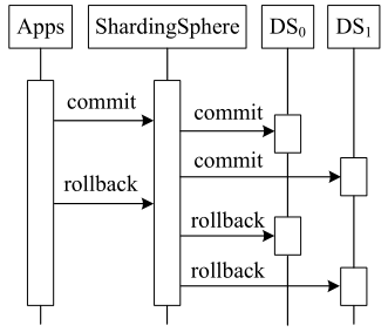 本地事务。如图 6,当 ShardingSphere 接收来自用户应用程序的“COMMIT”或“ROLLBACK”命令时,它会直接把该命令传输到所有数据源。即使某些数据源提交失败,ShardingSphere 也会忽略它。因为 Local 事务没有准备阶段,故可以提高效率。