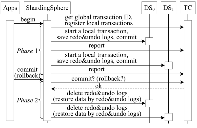 XA 事务。原生 XA 事务共有三个角色:AP、RM、TM,开发人员如果要使用 XA 事务,会有较大的学习成本。ShardingSphere 扮演了 AP 和 TM 的角色,因此开发人员能够像使用单机版事务一样使用 XA 事务。如下图 5,当应用程序向 ShardingSphere 发送“提交”请求,ShardingSphere 将记录日志并启动 2PC(两阶段提交)过程:第一阶段,ShardingSphere 向所有数据源发送“准备”消息,以检查该事务是否可以提交。如果一个数据源确定可以提交它自己的事务,它会向 ShardingSphere 发送一个“ok” ;否则,它会发送一个“no”,并回滚它所做的事情。若所有数据源都“ok”,ShardingSphere 则向所有数据源发送“commit”,否则发送“Rollback”通知回滚。数据源根据命令进行操作。