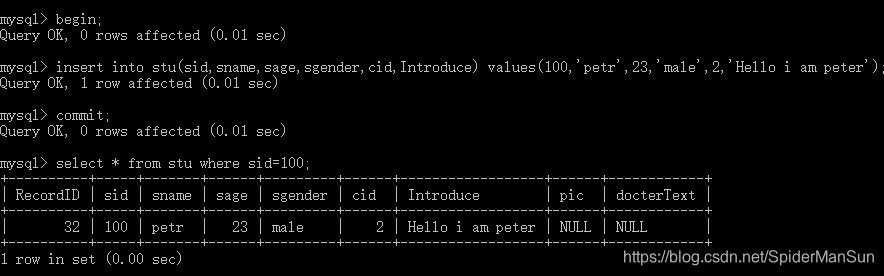 insert into stu(sname,sage,sgender,stuinfo,cid) values('peter',22,'male','hello i am peter',1),('alice',22,'female','hello i am alice',1),('sam',23,'male','hello i am sam',2);