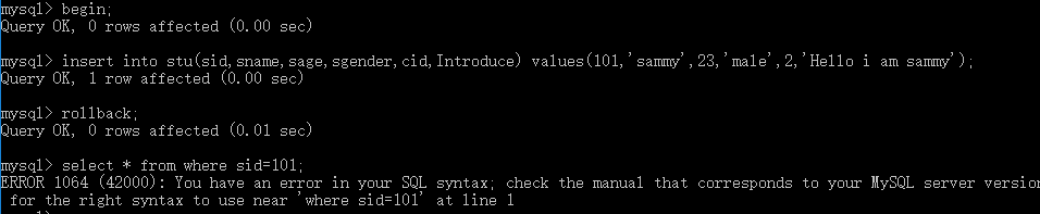 由于事务回滚了,所以在开启事务之后执行的语句都相当于撤回了,所以演示的时候查询回滚的数据会出错。