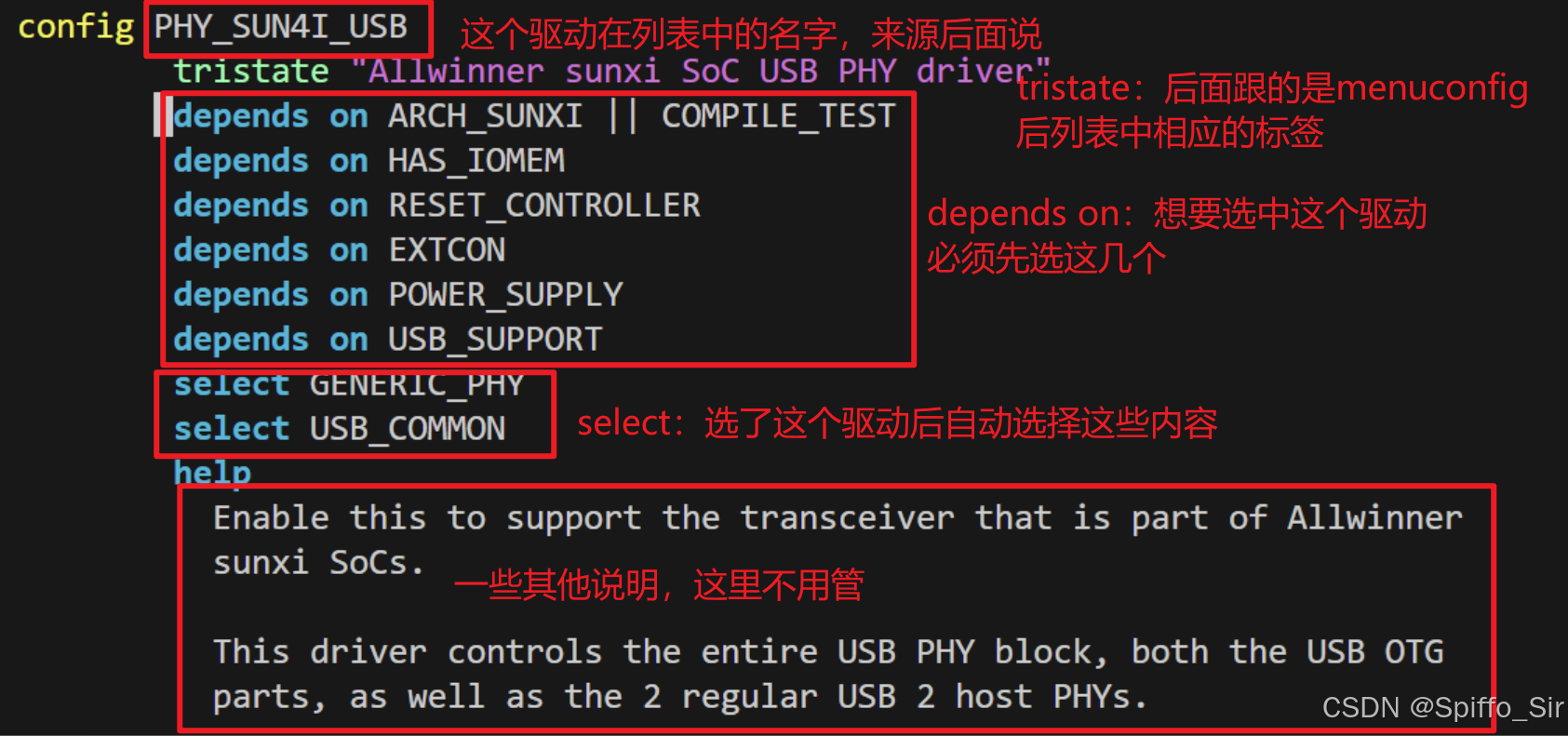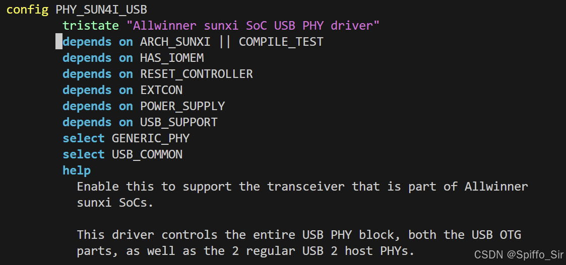 (1)Kconfig:指定内核某个功能驱动的可选配置列表,并说明其在menuconfig中的标签以及相关依赖(这个依赖指在勾选该配置之前必须先勾选编译其依赖,否则不能被选中编译),比如在kernel/drivers/phy/allwinner下的Kconfig如下: