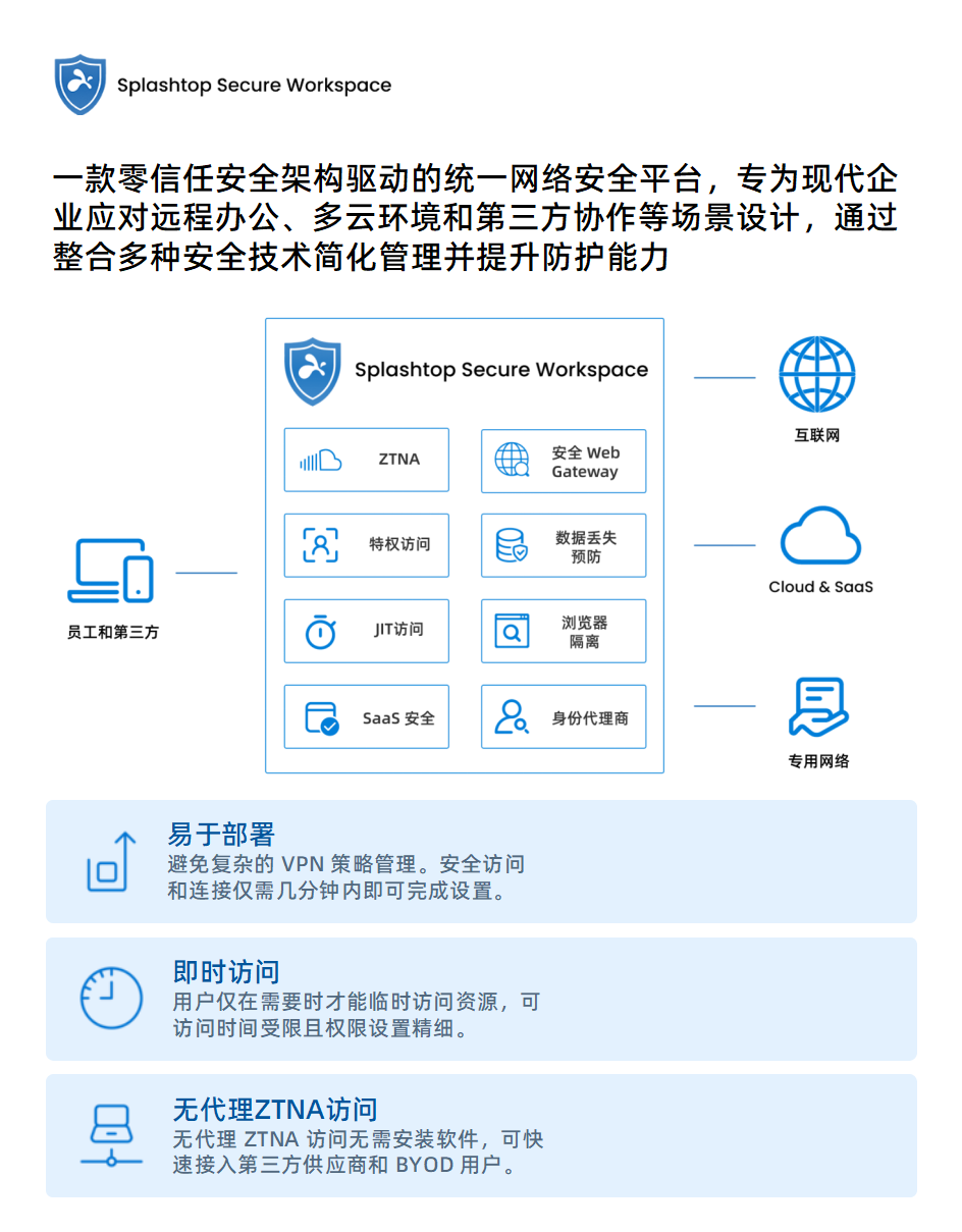 面向办公、外包协作与供应链协同场景,Splashtop Secure Workspace 专为现代企业应对远程办公、多云环境和第三方协作等场景设计,通过整合多种安全技术简化管理并提升防护能力。
