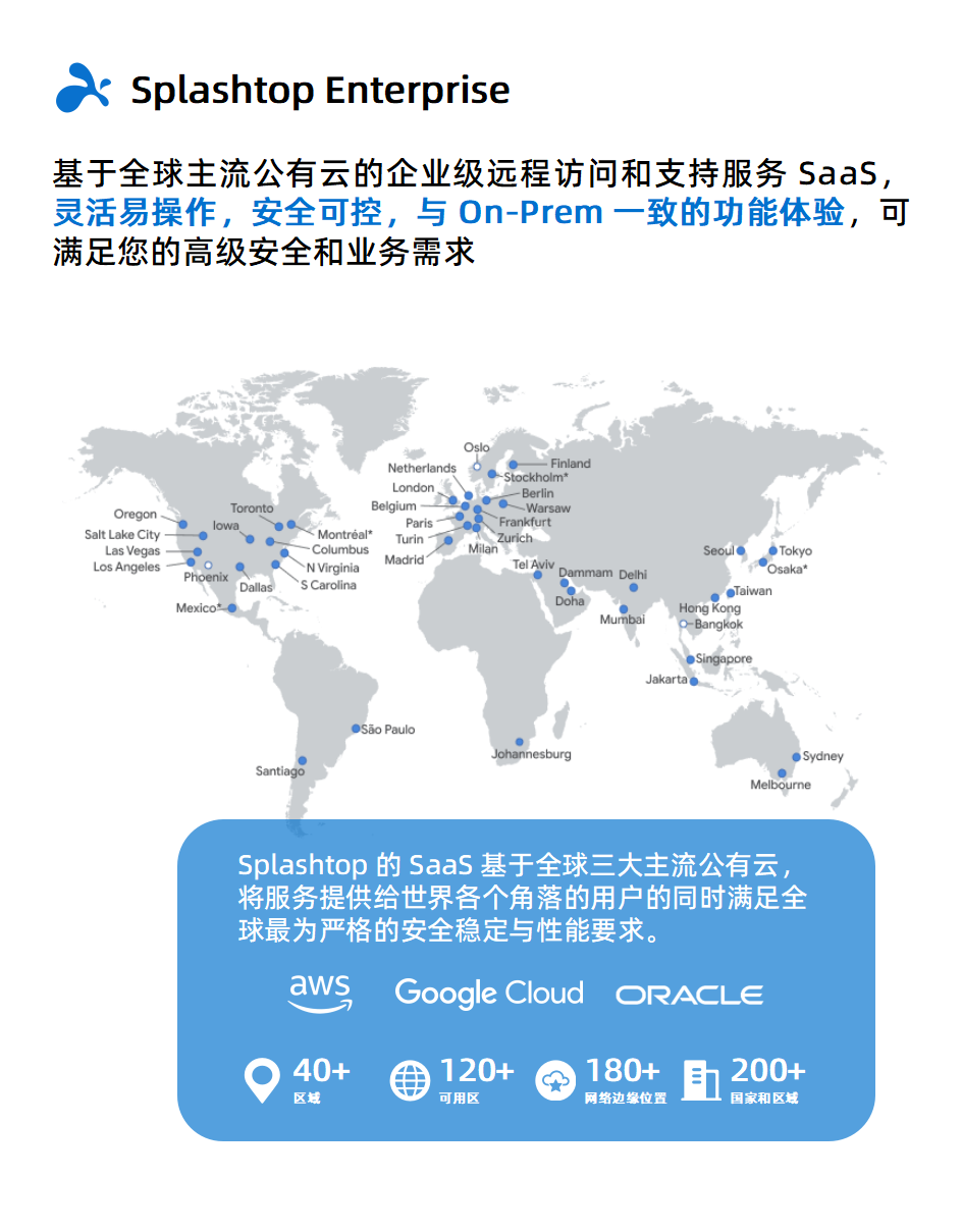 作为企业级远程访问和支持服务SaaS,Splashtop Enterprise 面向多分支、跨地域的企业, 提供灵活易操作,安全可控的远程访问能力,有效支持办公团队、外协技术人员与合作伙伴的高级安全和业务需求。