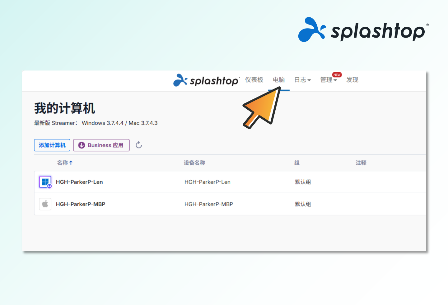 1.登录 Splashtop 网络控制台,在顶部点击【电脑】