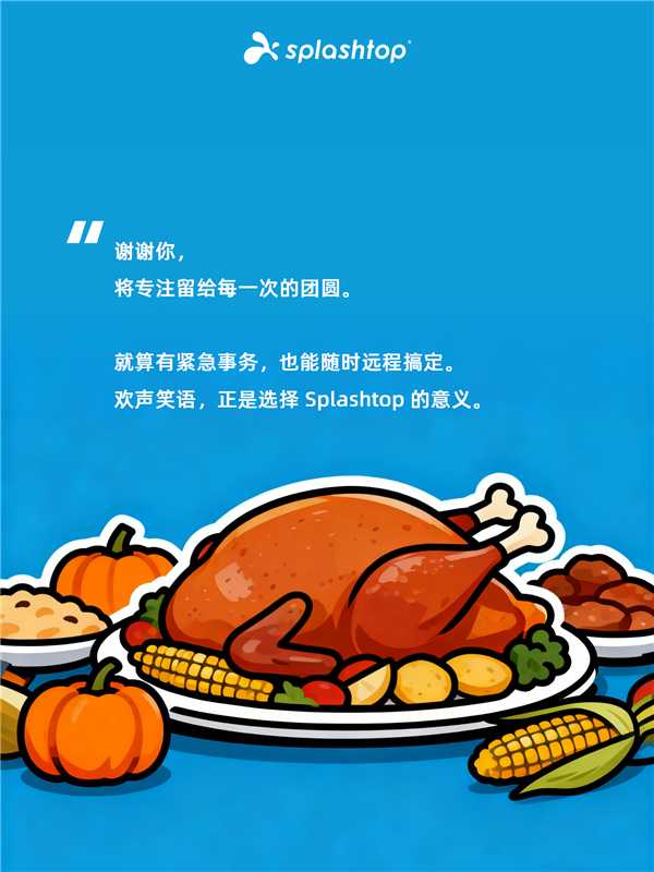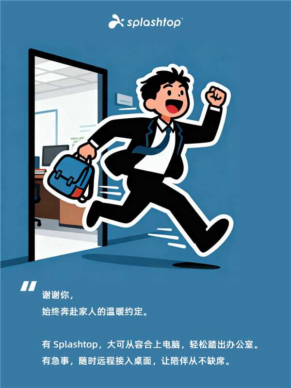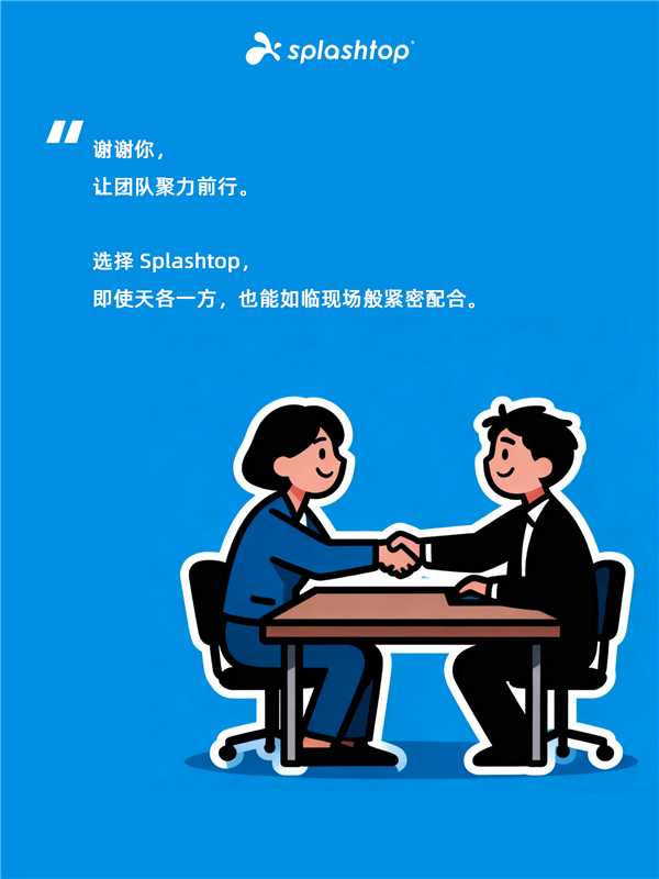 科技的意义,从来不是让我们被工作束缚,而是赋予更多选择与自由。 感谢您选择 Splashtop。 愿每一次高效的远程办公,都能换来一次安心陪伴家人的时光。 在这个世界上有那么多官号,感谢你愿意停下来,听我们聊聊远程连接的这些事儿。