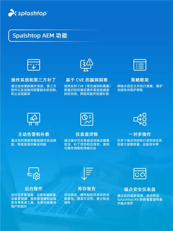 Splashtop AEM 是一款自动端点管理解决方案,能够在无扰日常工作的情况下,自动推送并部署补丁。通过该系统,IT 团队可高效完成操作系统与应用程序更新,减少手动操作带来的延误与差错: