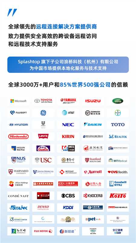Splashtop Inc.(中文名:浪桥科技)成立于2006年,是全球领先的远程连接解决方案提供商,专注于提供安全高效的跨设备远程访问与技术支持服务。公司总部位于美国硅谷,并在杭州、东京、新加坡、阿姆斯特丹和台北等区域设有分支机构,其核心团队来自英特尔、摩托罗拉、惠普、华尔街等机构,拥有前沿技术实力与丰富行业经验。