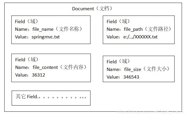 这里我们可以将磁盘上的一个文件当成一个document,Document中包括一些Field(file_name文件名称、file_path文件路径、file_size文件大小、file_content文件内容),如下图: