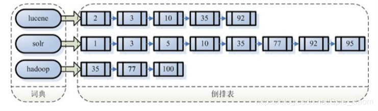 倒排索引结构是根据内容(词语)找文档,如下图:
