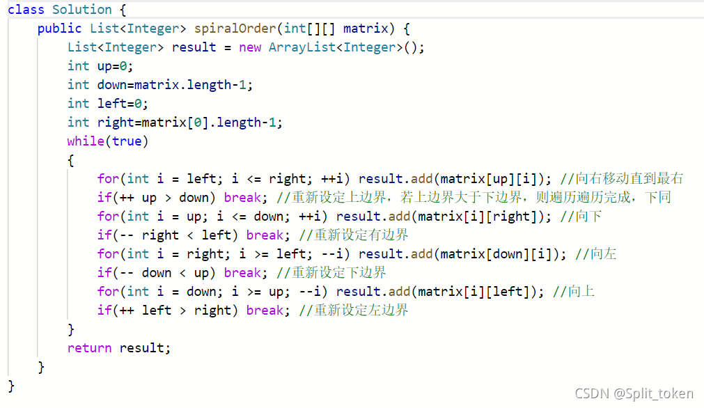 3、判断若重新定义后,上下边界交错,表明螺旋矩阵遍历结束,跳出循环,返回答案
