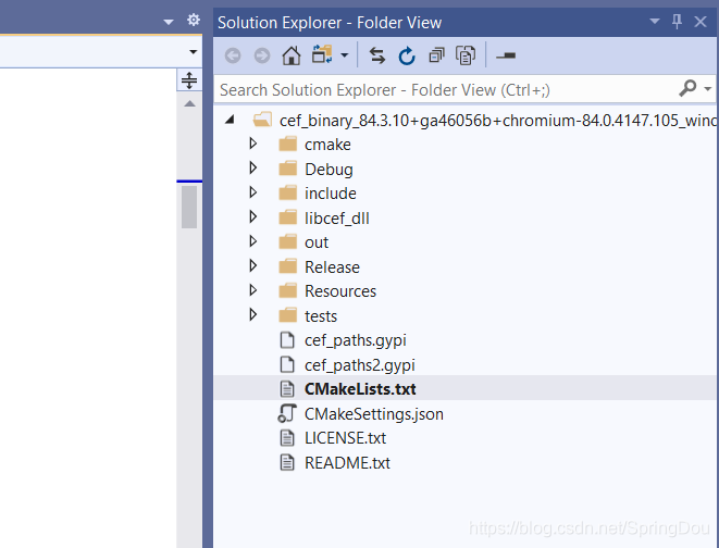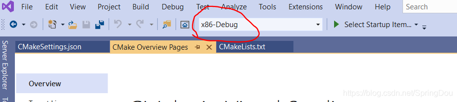 菜单File-Open-CMake,打开code所在的目录A,目录A下有个CMakeLists.txt. 打开这个文件, vs2019界面显示如下: