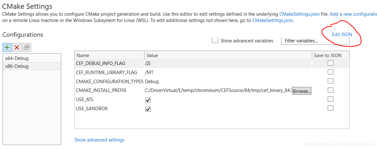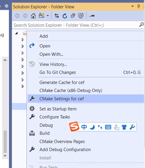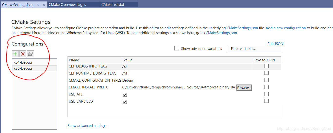 9.选择x86-Debug, vs2019就会自动产生cef的solution在A\out\build\x86-Debug,该目录可以在第7步骤进行修改(buildRoot)。