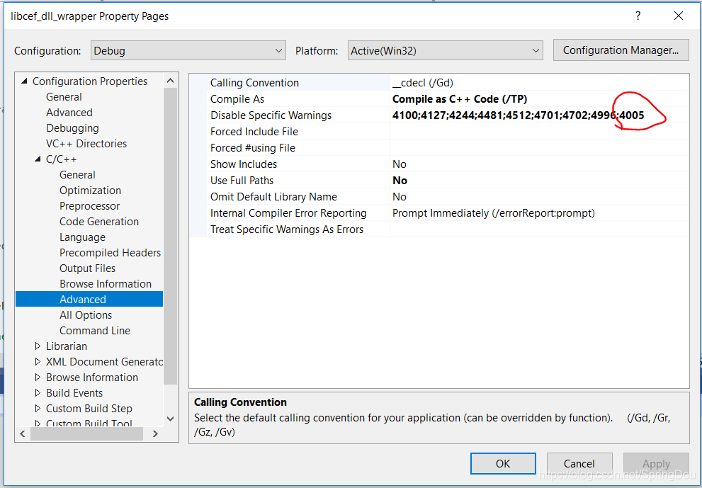 12. 直接编译工程,容易出现C4005的warning, 右键选择libcef_dll_wrapper工程,打开属性窗口在如下界面禁掉warning 4005: