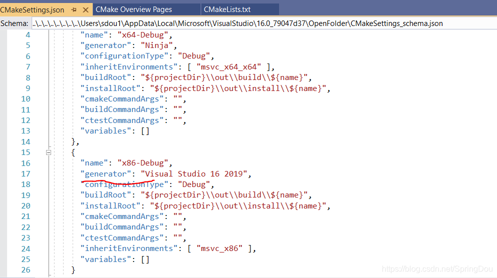 7. 编辑上面图中的generator,改写为Visual Studio 16 2019, 默认是Ninja. Ninja也是个跨平台的编译器。保存文件