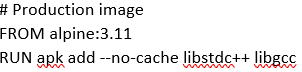 下面是最后的运行的image alpine:3.11, 由于alpine是很干净的系统,所以我们要运行编译完的image的话,需要