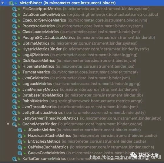 为了访问这些统计数据并将其转换为特定指标,Micrometer 引入了 MeterBinder 的概念。