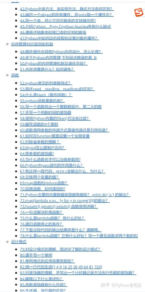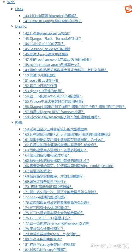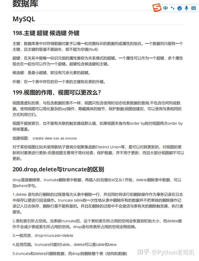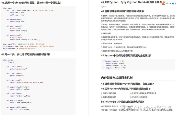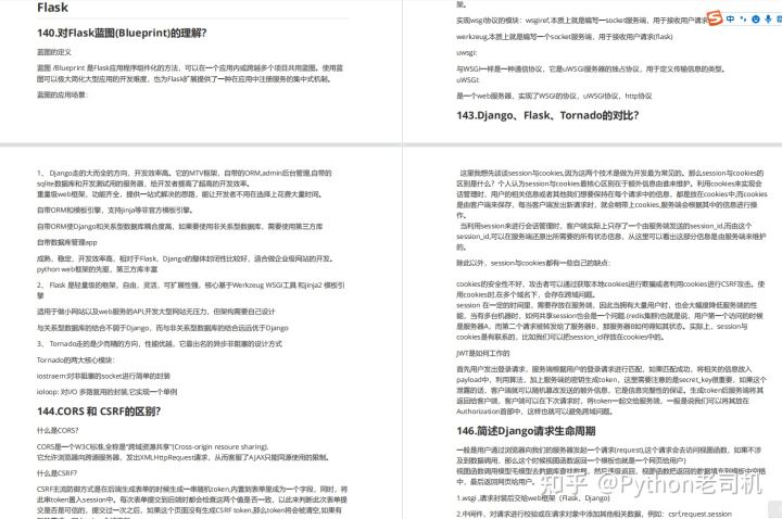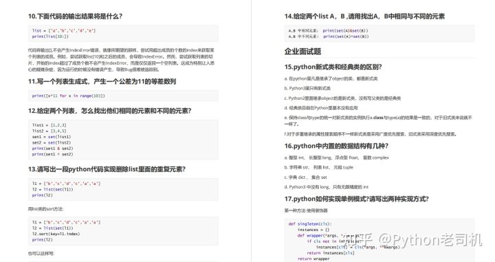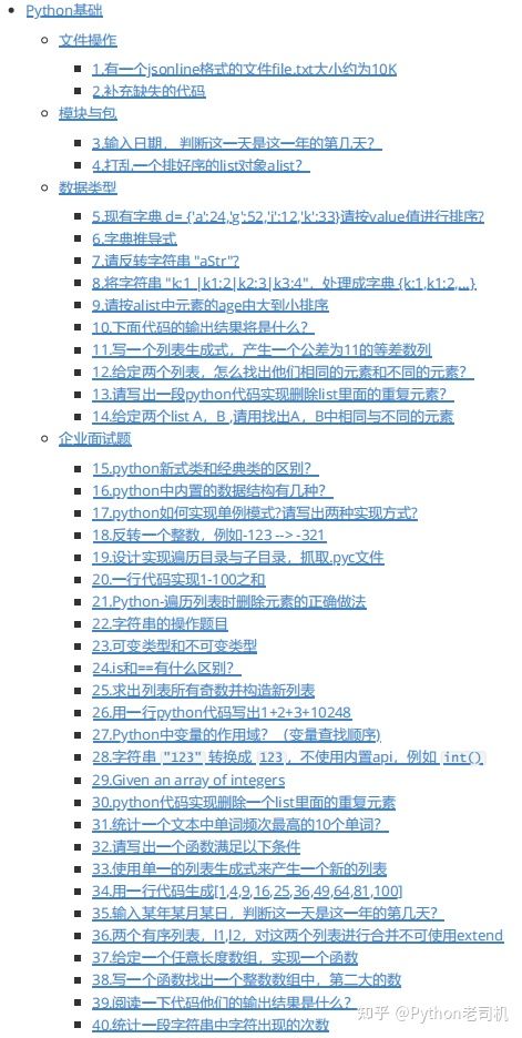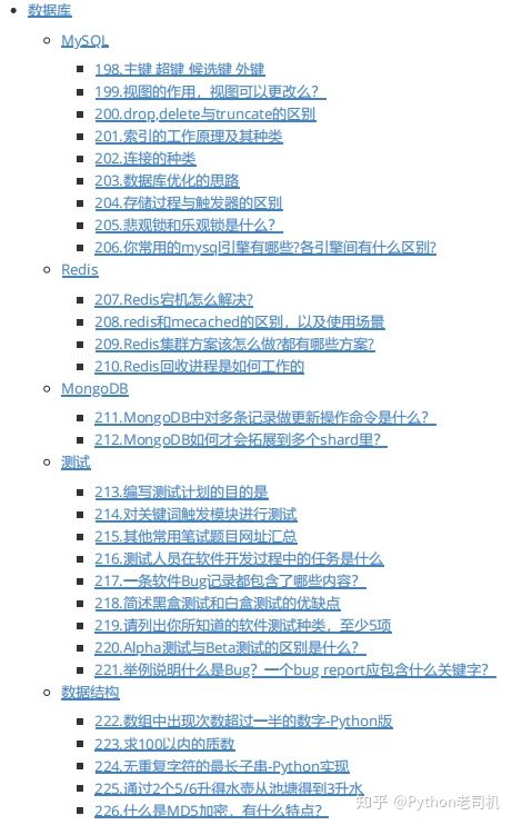 我认为,对于Python面试前的准备最佳方法莫过于刷题+总结,所以我帮大家总结了一系列大厂面试中常问的面试技术点,深入解析以及答案,并且制作成了一份PFD文本并命名为 《Python面试宝典》。这份宝典将从Python基础→Python高级→web→数据库等全面的讲解。每一个面试问题都有详细的解答,代码整洁,图文并茂,并且容易理解。在这里我分享出来给最近准备面试的各开发者去大厂保驾护航。