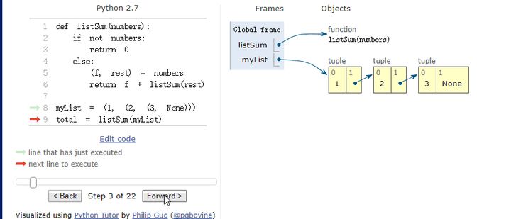 如果你不知道代码在内存中是如何运行的,不妨把它拷贝到Tutor里可视化执行一遍,加深理解。