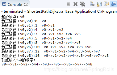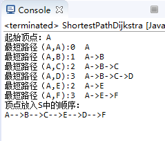 System.out.print("最短路径(" + vertexes[vs] + "," + vertexes[i] + "):" + U[i] + " ");