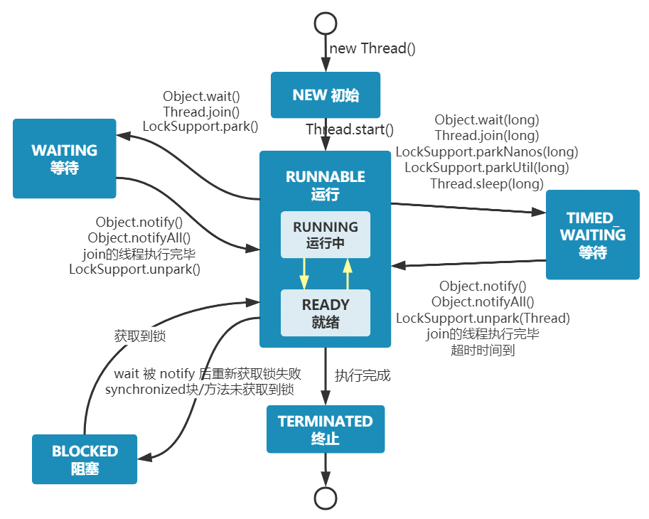 在操作系统层面,线程有 READY 和 RUNNING 状态;而在 JVM 层面,只能看到 RUNNABLE 状态,所以 Java 系统一般将这两个状态统称为 RUNNABLE(运行中) 状态 。