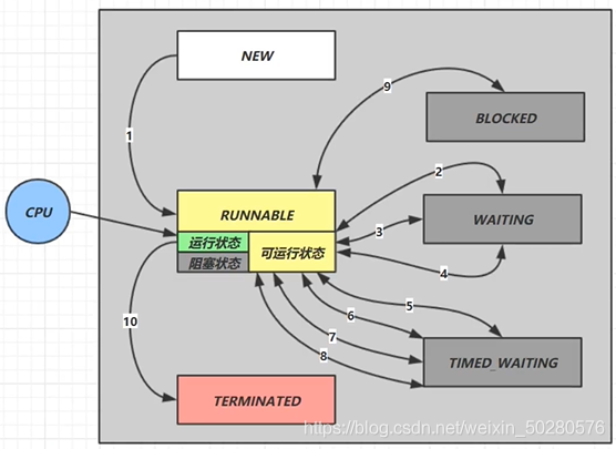 - TERMINATED:终止状态,表示该线程已经运行完毕。