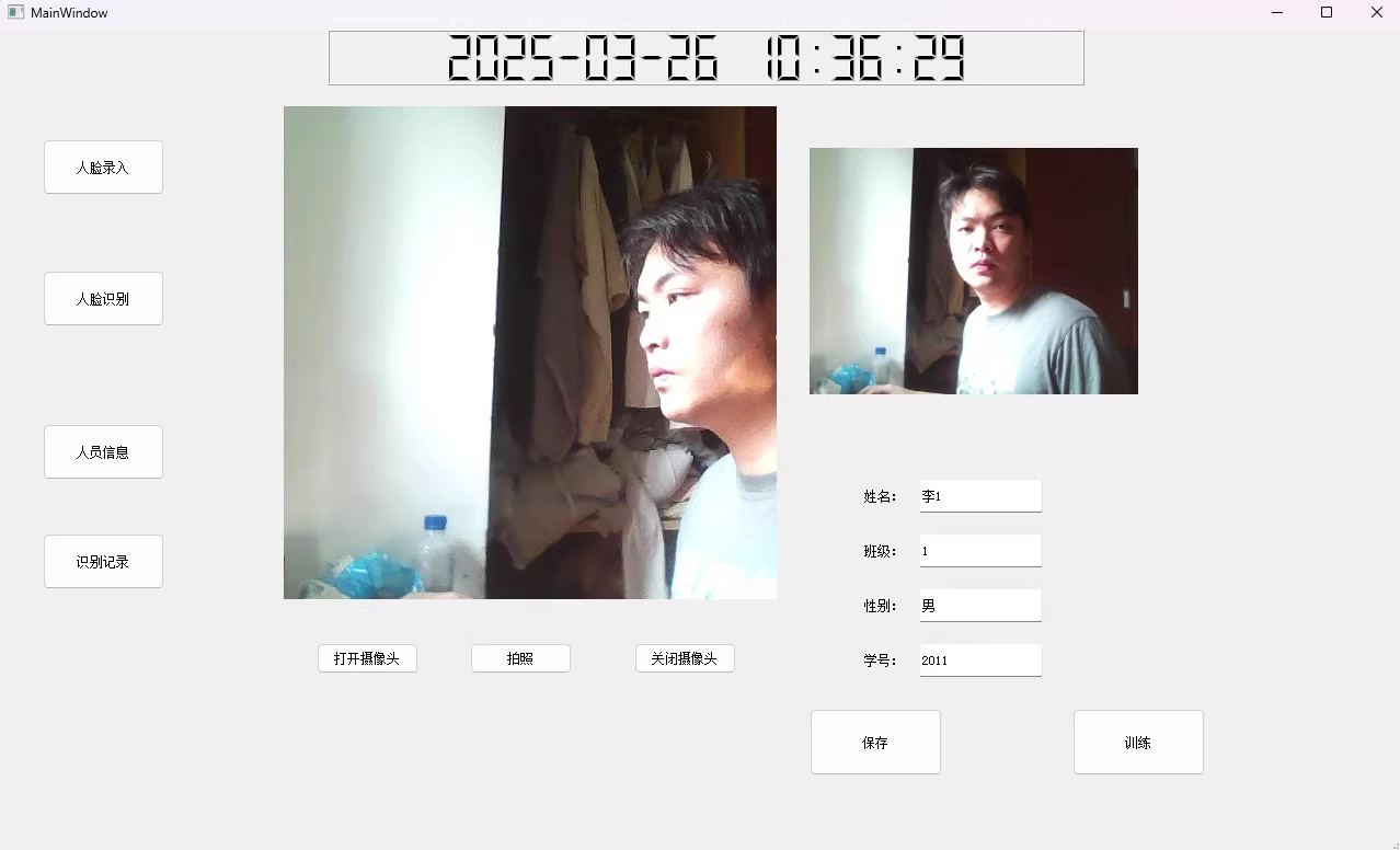 本系统基于人脸识别技术实现智能化课堂考勤管理,主要功能包括:学生人脸信息采集、实时考勤签到签退、考勤数据存储与查询统计。系统采用Python作为开发语言,前端使用PyQt5构建图形化界面,后端基于OpenCV实现人脸检测与LBPH(局部二值模式直方图)算法进行特征提取识别,识别准确率达95%以上。MySQL数据库存储学生信息与考勤记录,通过索引优化实现高效查询。系统有效解决了传统考勤方式效率低、易伪造的问题,具备非接触式、防作弊、自动化管理等优势,适用于高校课堂、企业会议等场景。