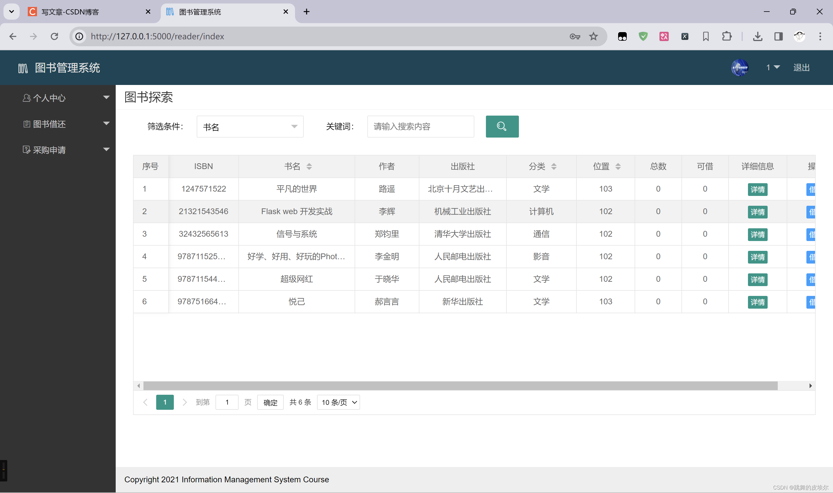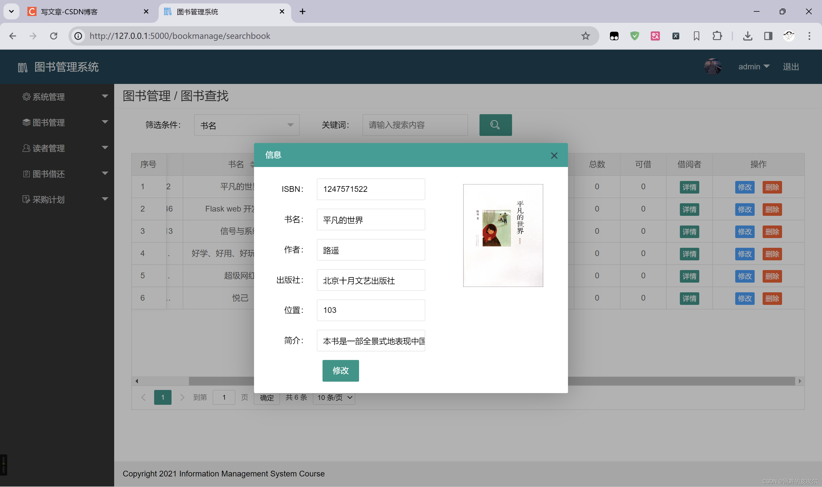 基于Flask+MySQL+HTML的图书借阅管理系统,包含用户端和管理端功能。用户端有图书浏览、借阅、归还、个人借阅记录查询等,管理端有图书管理、用户管理、借阅记录管理等 Python Flask图书馆管理系统Python+Flask图书馆管理系统 可添加需求二次开发