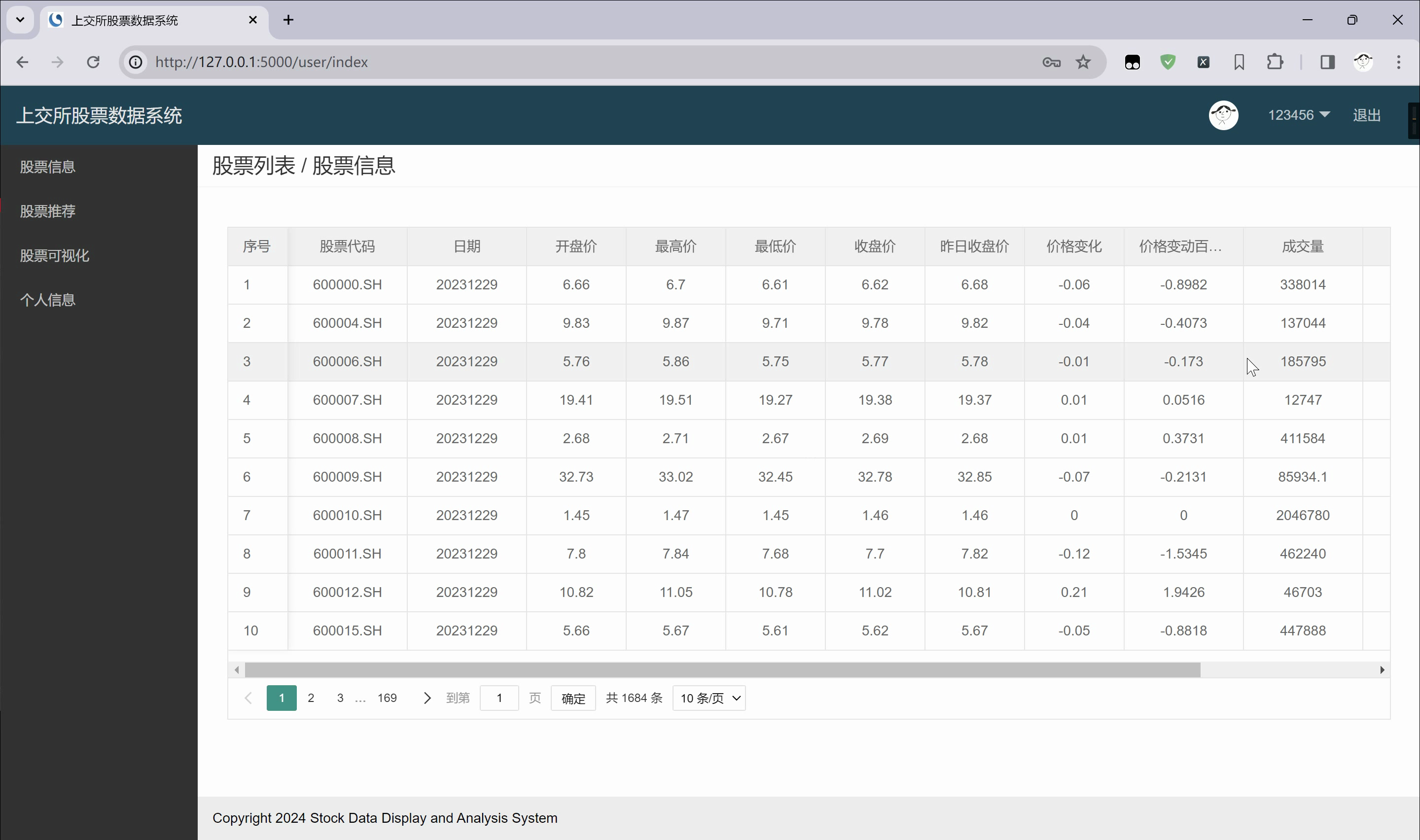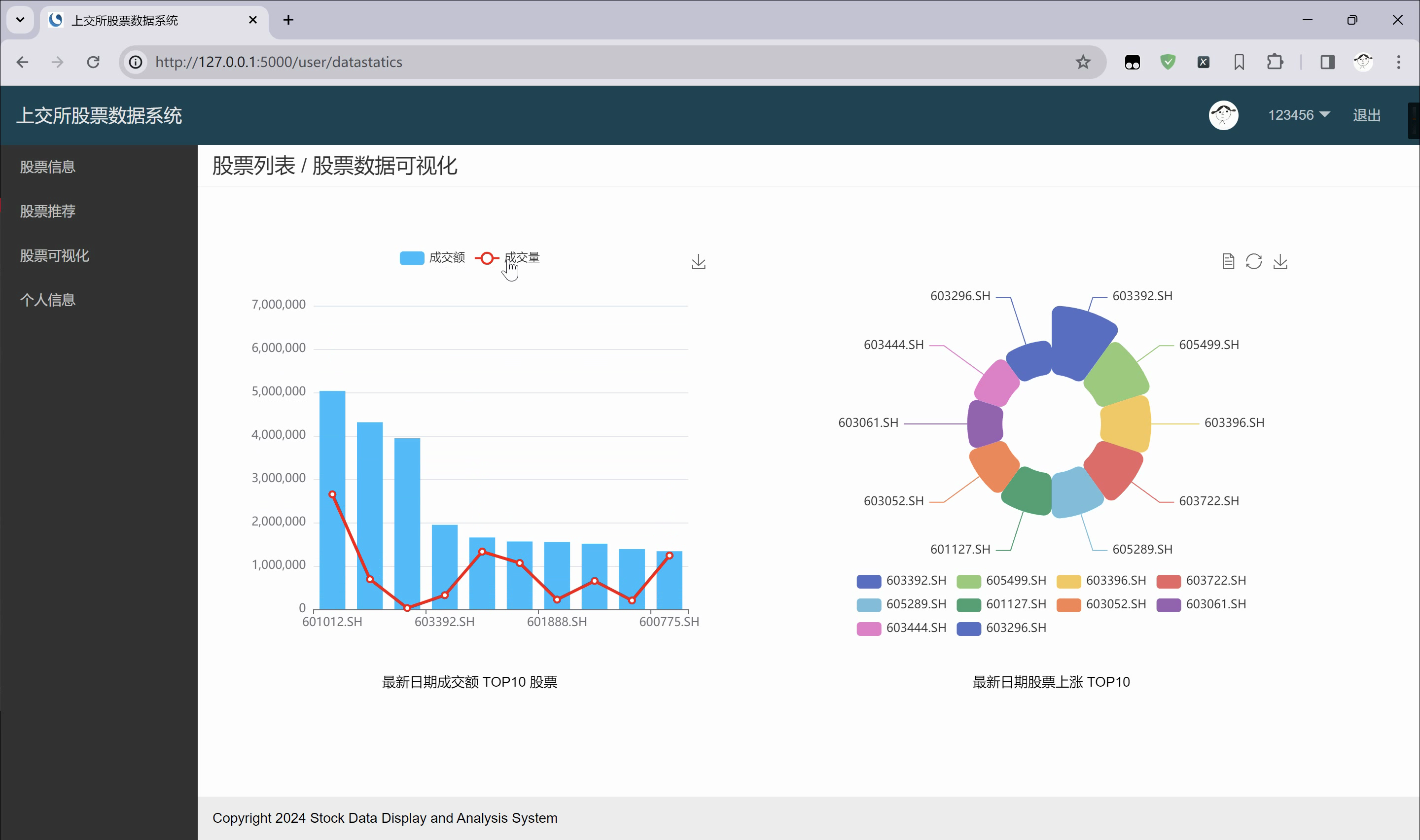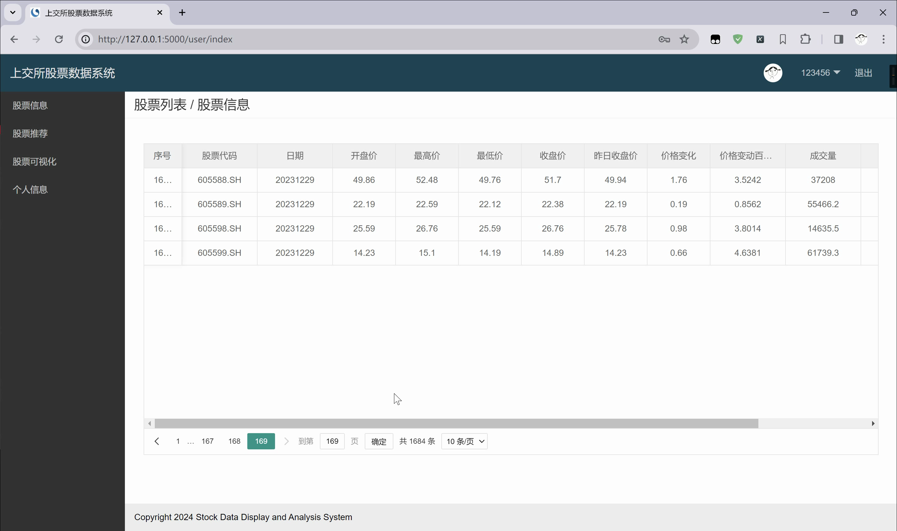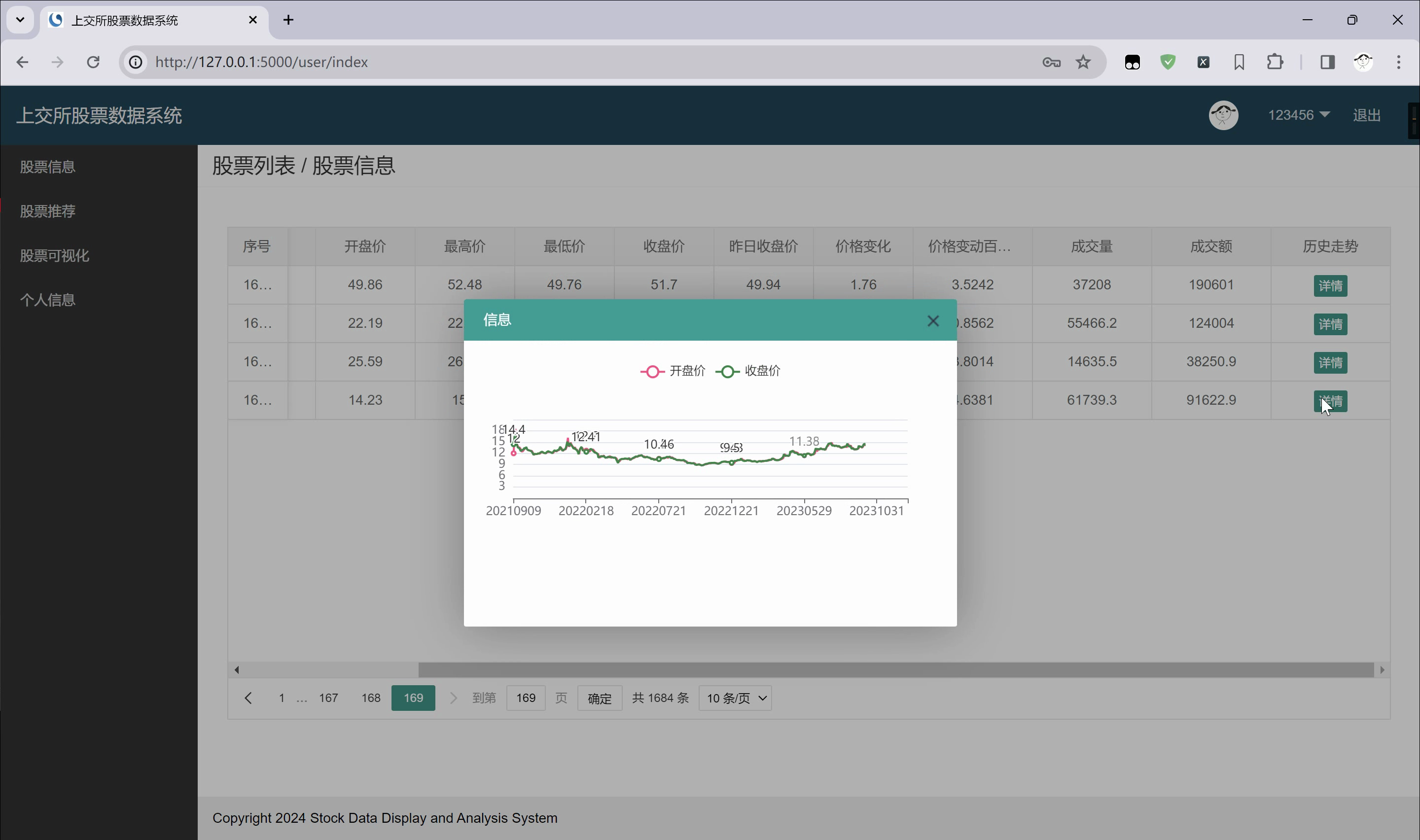 基于Flask的上海证券交易所股票数据分析与可视化系统进行采集数据,将采集数据经过数据清洗后储存于MySQL数据库,使用Flask框架实现股票预测模块,股票推荐模块、实时行情模块等主要功能。