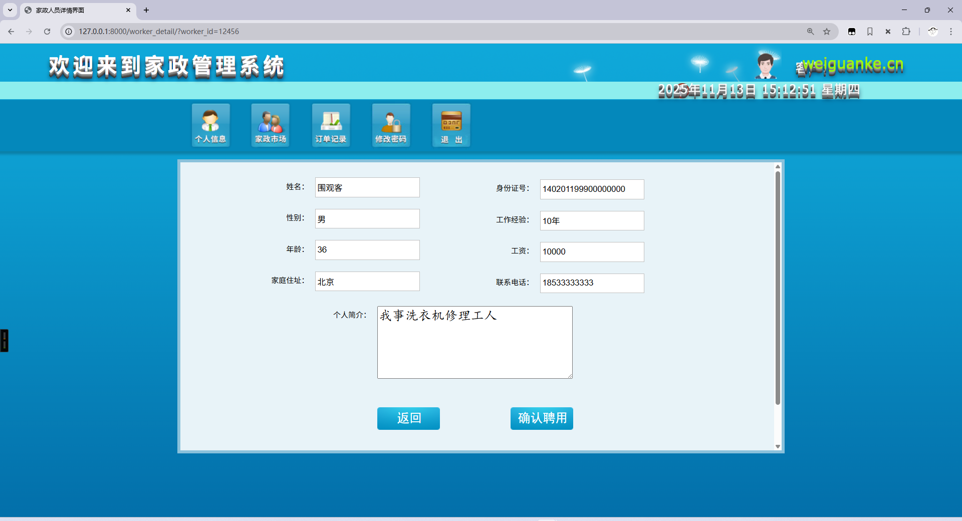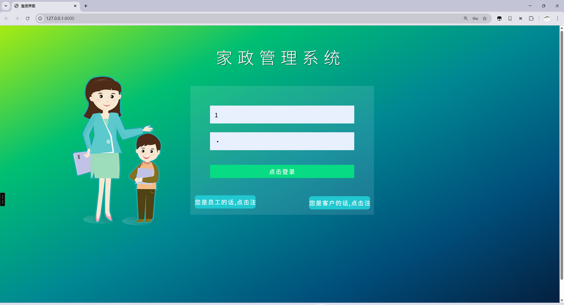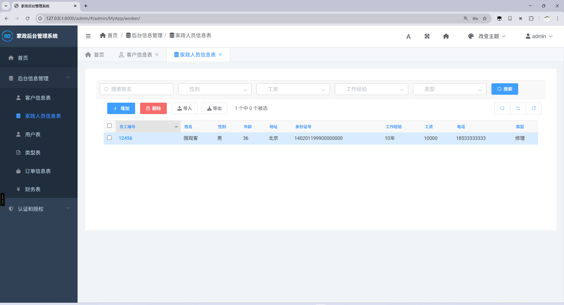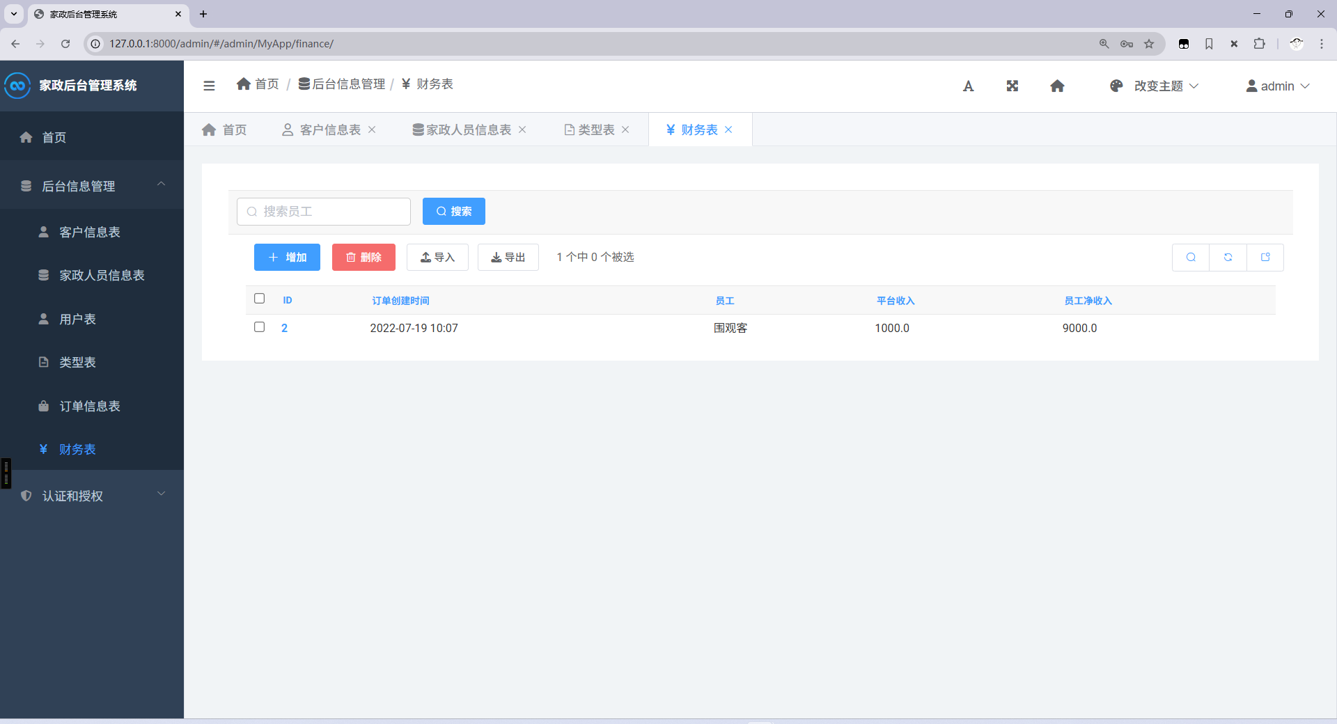 基于Django框架开发一个家政管理系统 一个有三个身份:家政员工,客户和管理员。 员工和客户都可以在前台注册登录,客户登陆后可以修改个人资料,查询家政市场的服务人员,查看自己预定的家政人员服务记录,修改密码和退出; 员工登陆后可以修改个人信息,查询自己的服务订单记录,查看公司给自己分配的财务记录,修改密码和退出; 管理员后台登陆后可以管理所有的信息