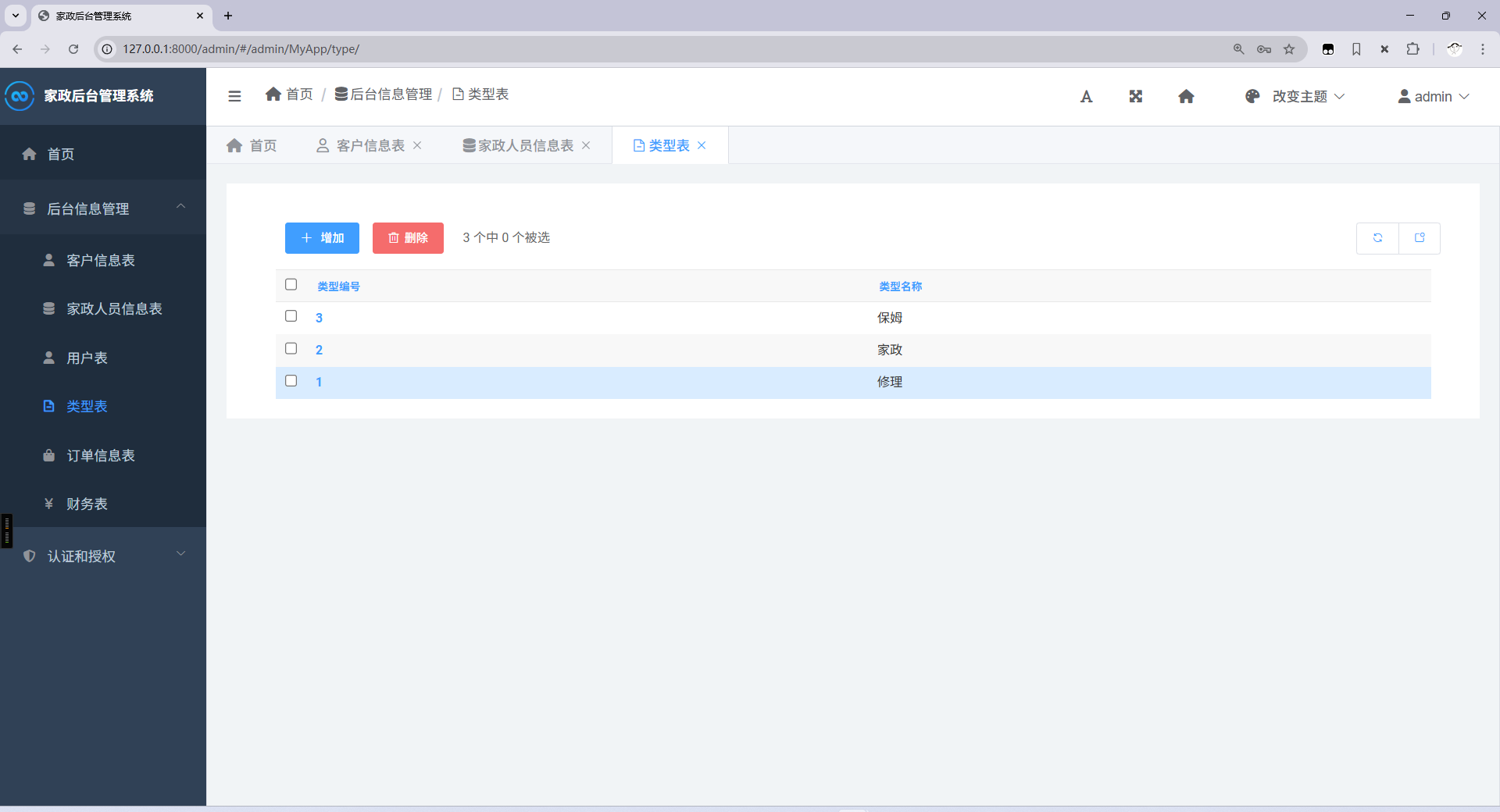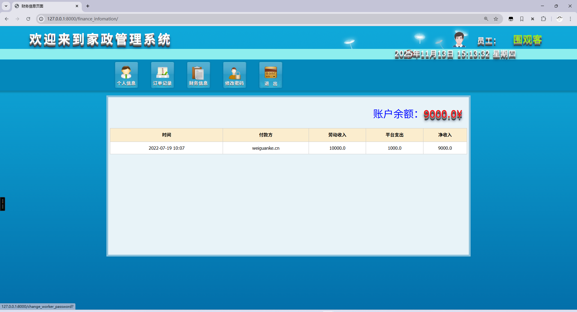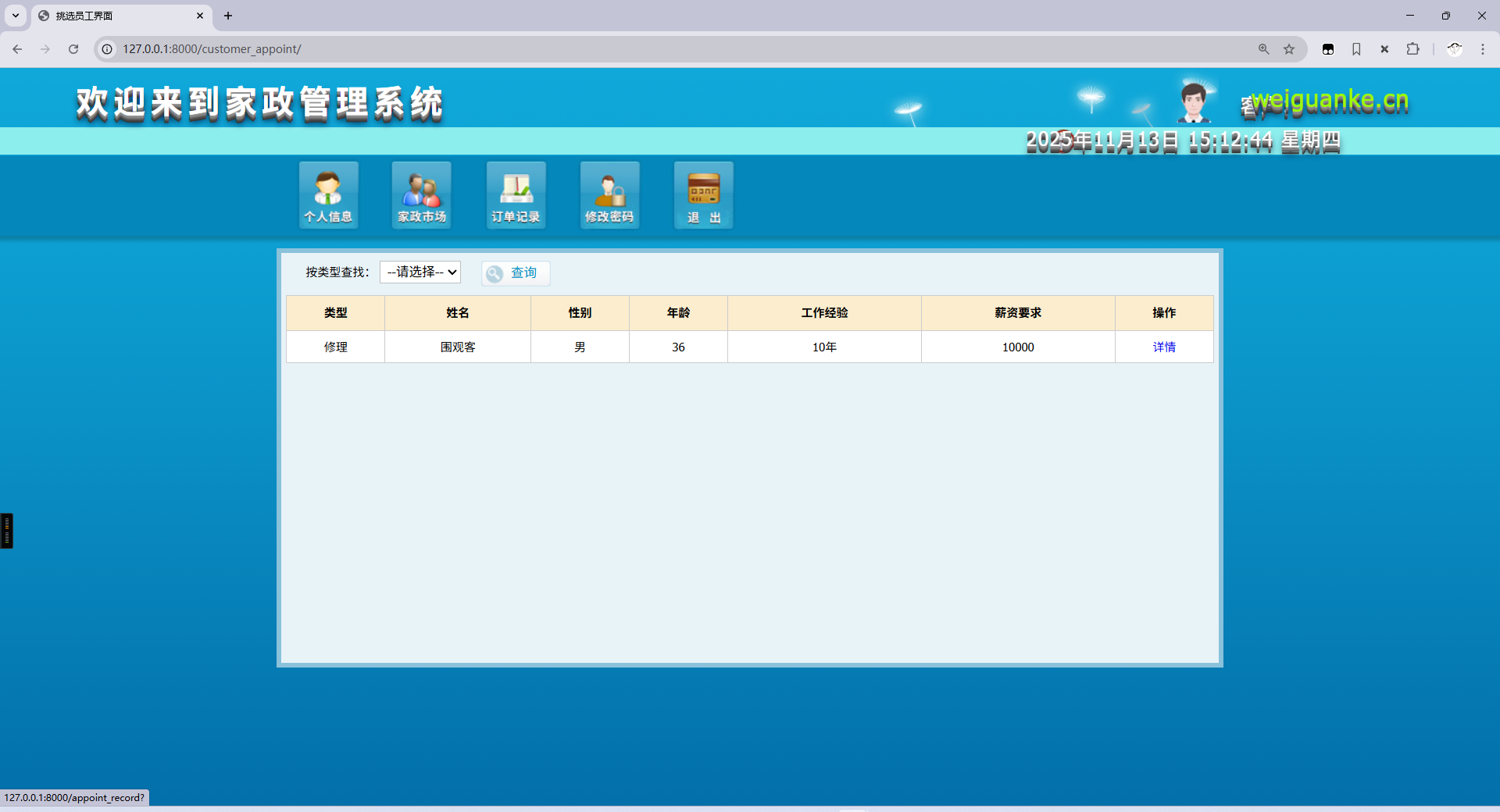 基于Django框架开发一个家政管理系统 一个有三个身份:家政员工,客户和管理员。 员工和客户都可以在前台注册登录,客户登陆后可以修改个人资料,查询家政市场的服务人员,查看自己预定的家政人员服务记录,修改密码和退出; 员工登陆后可以修改个人信息,查询自己的服务订单记录,查看公司给自己分配的财务记录,修改密码和退出; 管理员后台登陆后可以管理所有的信息